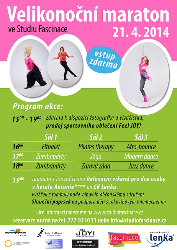 Chcete vytrénovat problémové partie, zdarma si vyzkoušet oblíbené lekce Fitbalet, Zumby, Pilates, Jogy nebo si zatancovat JazzDance či AfroBounce? Potom na Velikonoční pondělí 21.4.2014 nezapomeňte sbalit své fitness oblečení a dorazit na Velikonoční maraton ve studiu FASCINACE